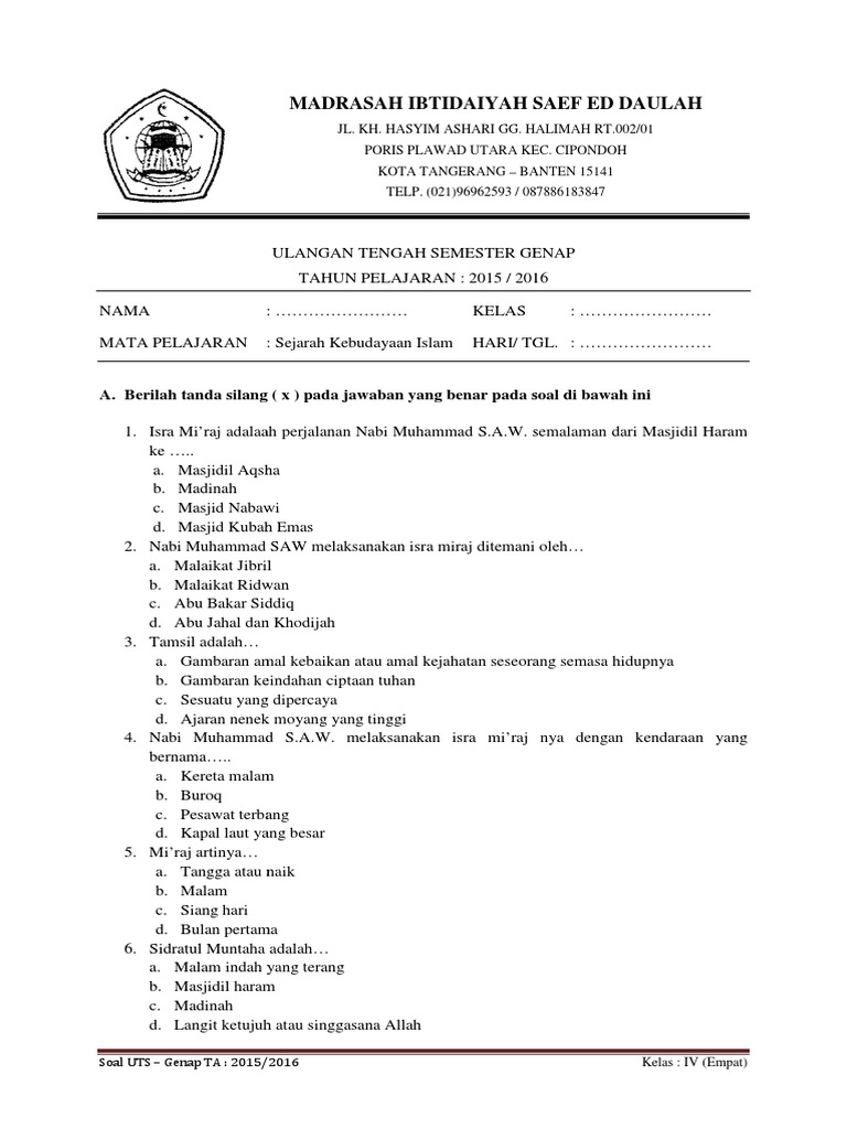 Soal pts ski kelas 8 semester genap 20i8 20i9 docx perpustakaan bijak. Abu ja far dan al mansur. Pilihlah jawaban yang paling benar dengan memberi tanda silang (x) pada jawaban a, Selamat datang pada kesempatan kali ini akan kami bagikan contoh latihan soal ukk / uas semester 2 (genap) kelas x dan xi sma / ma mapel ski / sejarah kebudayaan islam cuplikan soal ukk / uas ski kelas x semester 2 / genap : Doc jawaban soal ski sma ma kelas xi 11 semester genap jun soal sejarah kebudayaan islam kelas 4 semester ganjil 2018 2019 contoh kisi kisi dan soal ski kelas xi lengkap dengan kunci 2019 Soal uts ski kelas 5 semester 2 jawaban soal latihan ujian tengah semester kls v semester genap mata pelajaran sejarah kebudayaan islam terbaru disertai dengan kunci jawaban. Pilihlah salah satu jawaban yang paling tepat. Soal uas ski kelas x xi xii semester 1 ganjil memberikan bank soal soal dan kunci jawaban soal uas ski kelas x xi xii semester 1 ganjil Soal dan jawaban ski kelas xi semester 1. Selamat datang di blog pada. Ulangan akhir semester i tahun pelajaran 20132014 mata pelajaran. 1 standar isi bmr sd. Download contoh latihan soal uas ulangan akhir semester 1 ganjil kelas x xi xii ma mapel ski sejarah kebudayaan islam dan kunci jawaban.
